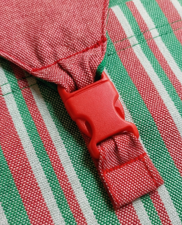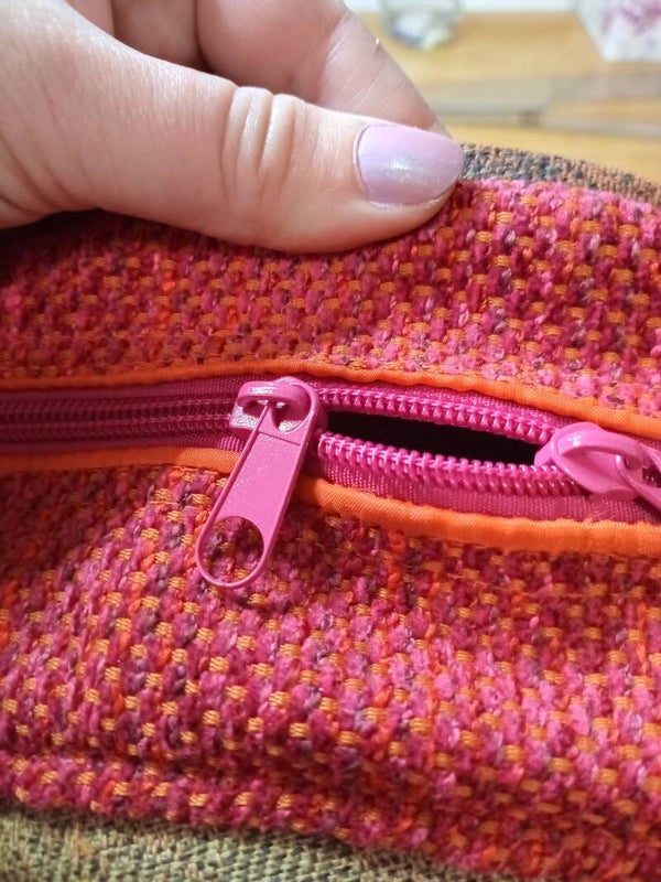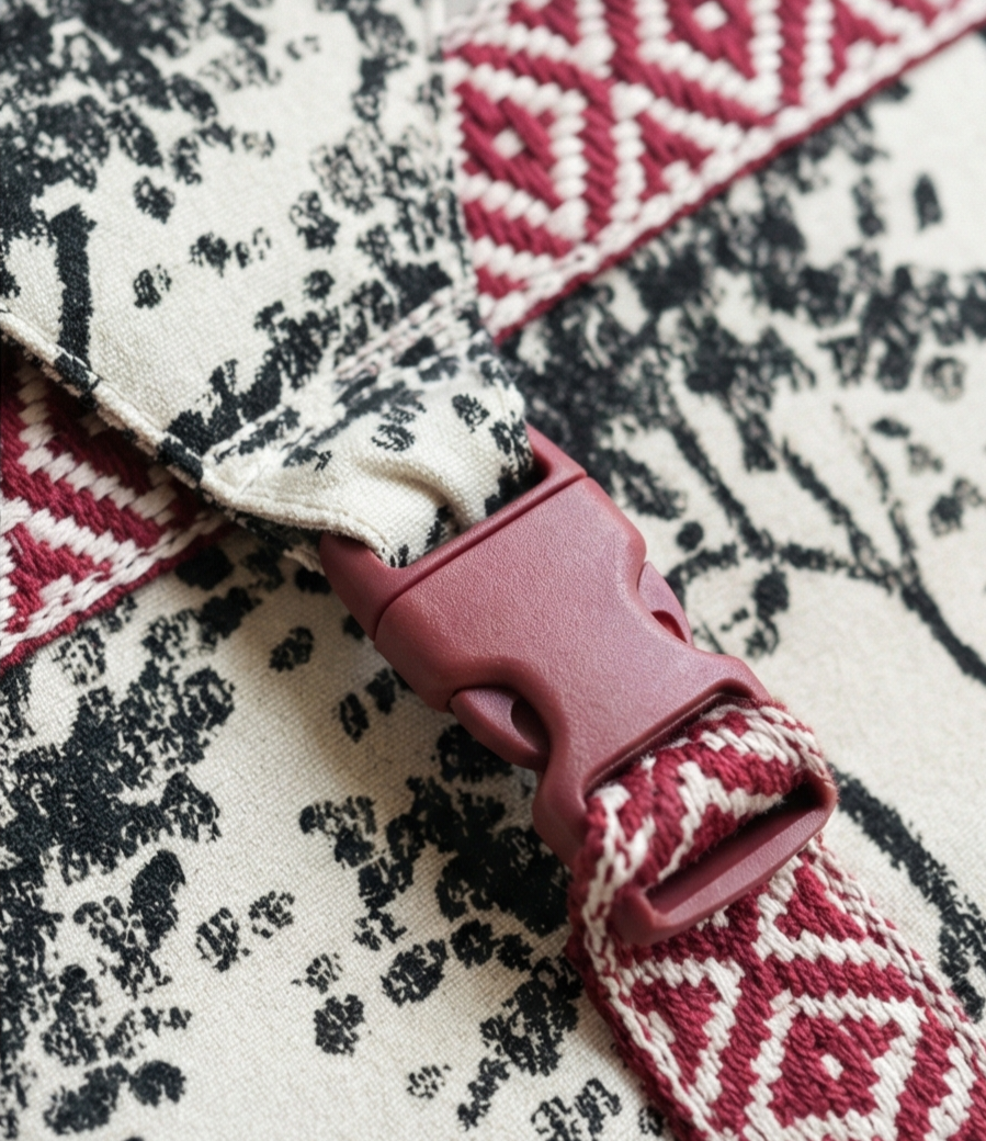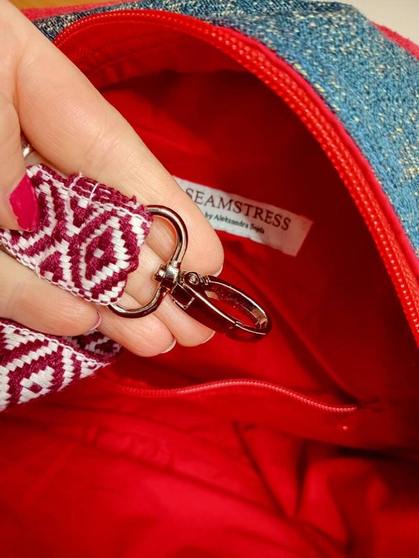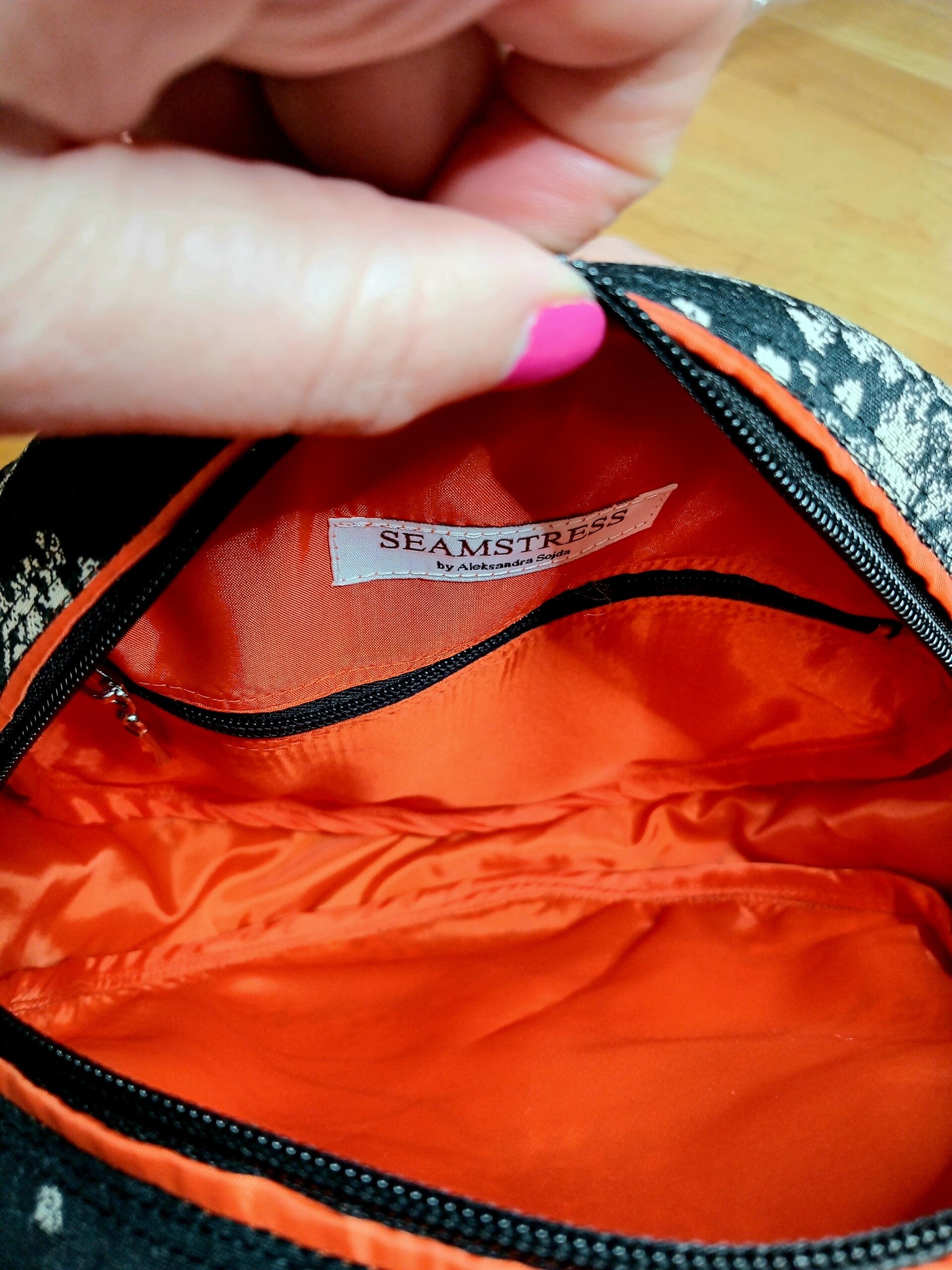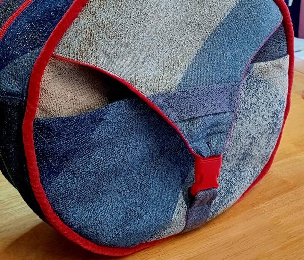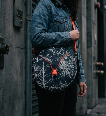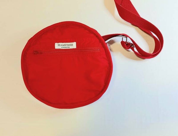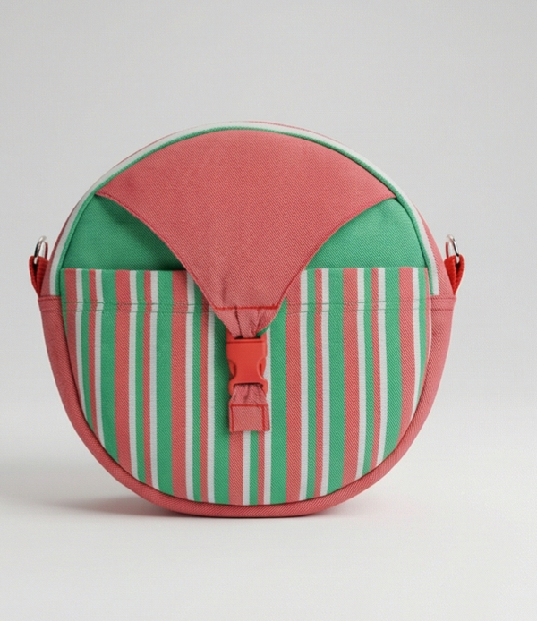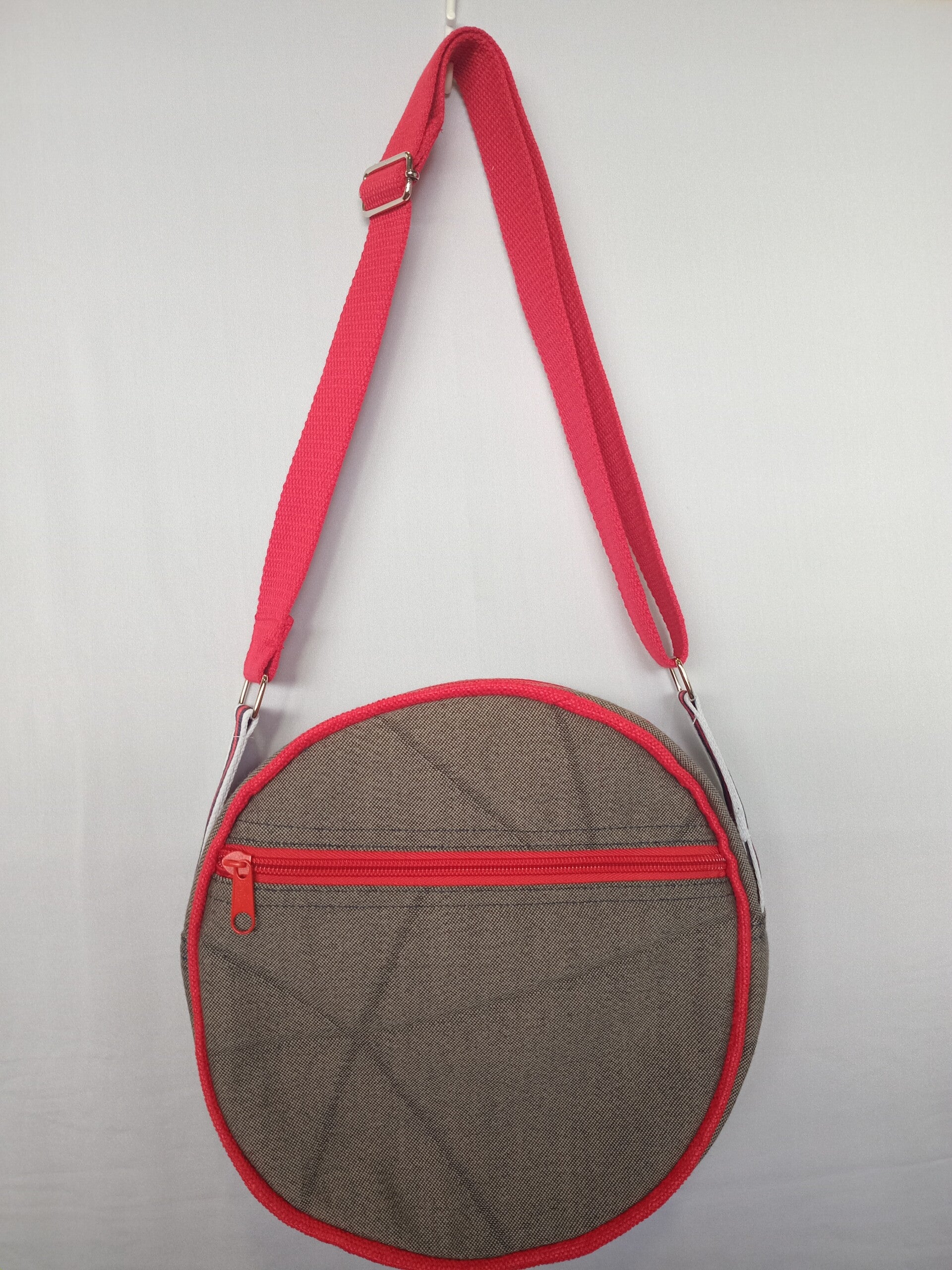 A circular bag with a zipper closure, crafted from recycled upholstery fabric. The bag features a front pocket with a buckle closure and a back pocket with a zipper closure.
