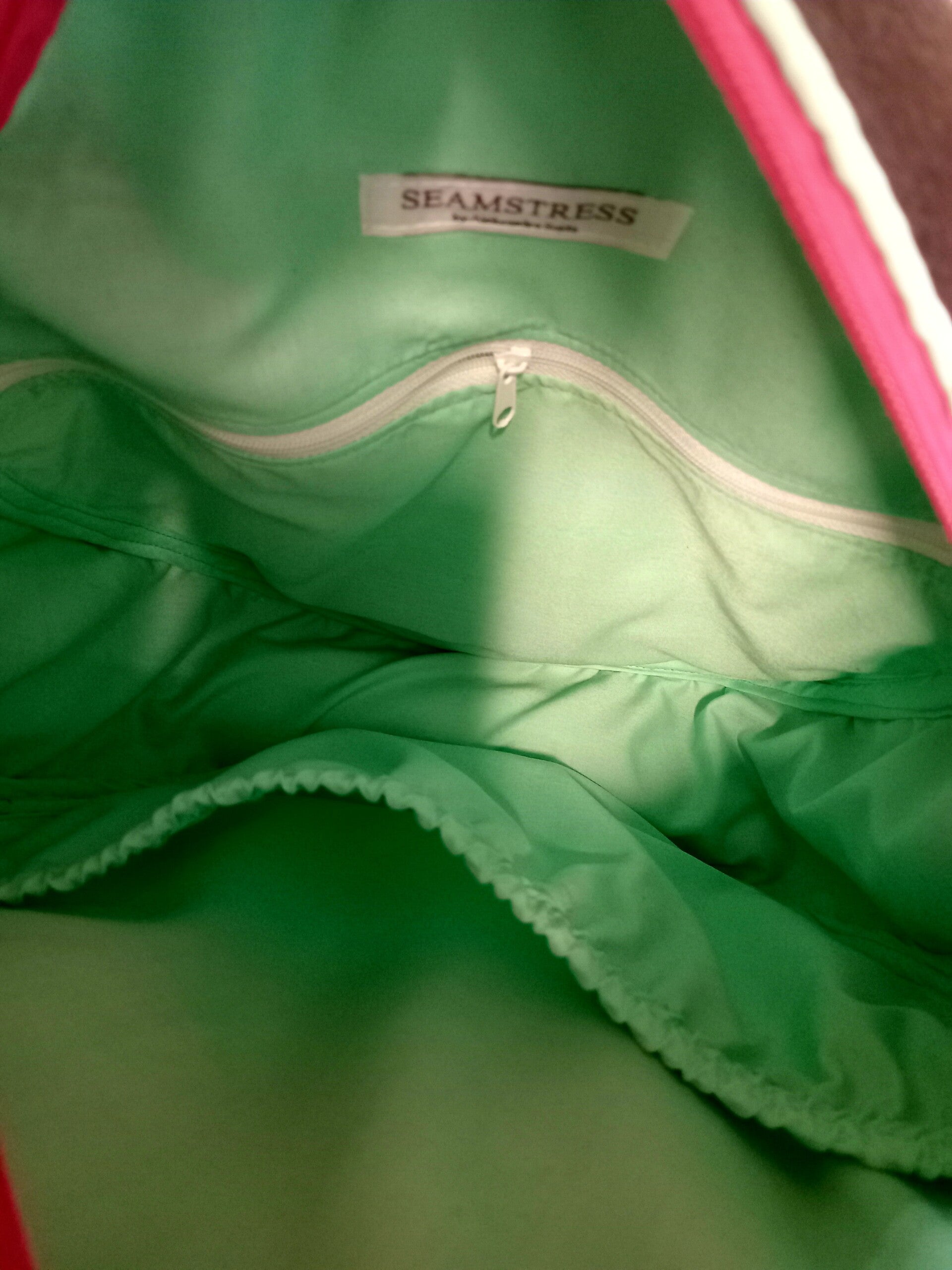 The inside of the bag is lined, has a zippered a pocket with a lobster clasp for keys or purse.