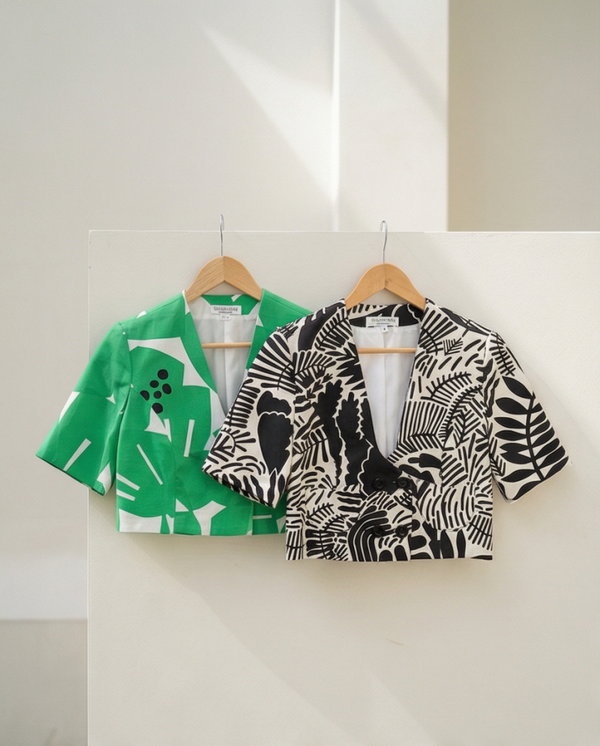 A short, button-down cotton jacket with short sleeves. The fabric is high-quality 100% cotton and is lined.