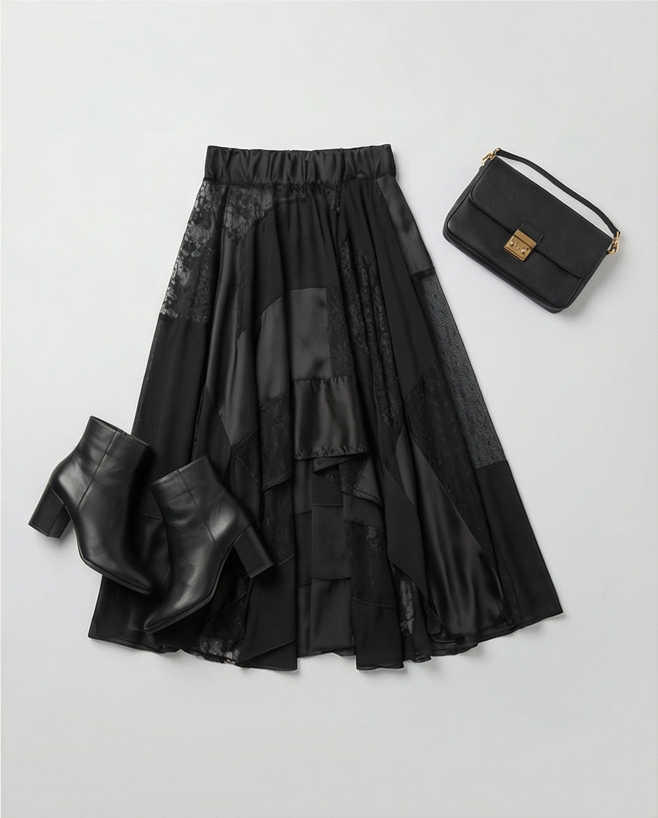 This patchwork skirt is made from scraps of various recycled fabric: lace, chiffon, and satin. It has a unique charm and lightness. The skirt has a full circle cut.